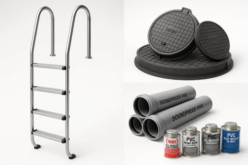 No, despite our name, we supply much more than just swimming pool equipment. Our product range includes HDPE pipes and fittings, PVC/UPVC piping systems, PPR pipes, irrigation systems, soundproof pipes, aluminum ladders, manhole covers, PVC glues, and various other construction and plumbing materials.